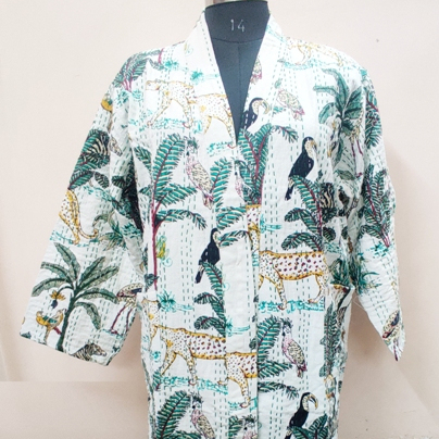 Handmade cotton kantha chần Kimono áo cổ điển Ấn Độ phong cách Safari rừng in phụ nữ đêm bãi biển mặc dài bên vành đai